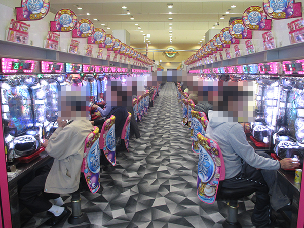 1円パチンコの海物語シリーズも大にぎわい。機種の性能を引き出しているといった姿が多く、にぎやかなムードが伝わってきた。
