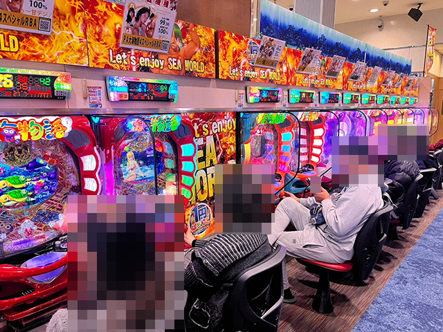 パチンコをみてみると、「新世紀エヴァンゲリオン~未来への咆哮~」や「Pフィーバー炎炎ノ消防隊Light ver.」などで、プレイヤーたちが楽しそうに遊技をおこなっていた。