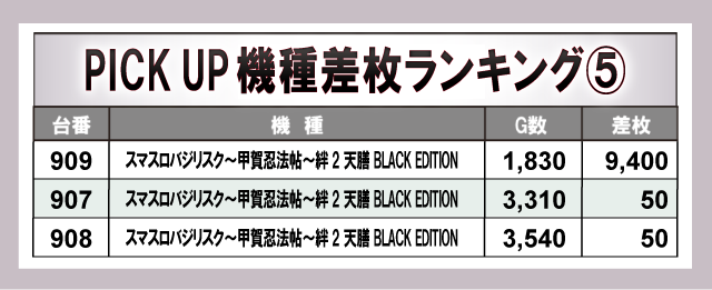 この日は『パチスロ 革命機ヴァルヴレイヴ』『スロット Re:ゼロから始める異世界生活 season2』から万枚OVERが発生し、店内の盛り上がりをリードしていた。『パチスロ 革命機ヴァルヴレイヴ』『スマスロバジリスク~甲賀忍法帖~絆2 天膳 BLACK EDITION』『Lスーパービンゴネオ』から、+9,000枚OVERと追随。また上表をご覧の通り、名を連ねているのは+3,000枚OVERからとなっており、想像以上の熱気に包まれていたかもしれない。同店の高い実力が窺えるばかりで、遊技していたファンは打ちごたえのある状況に歓喜したことだろう。