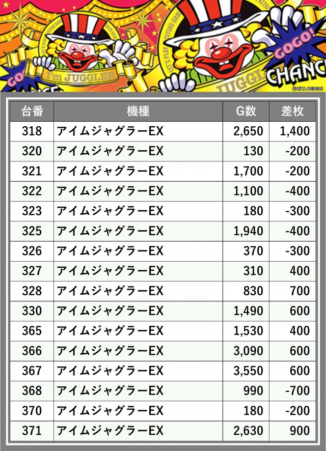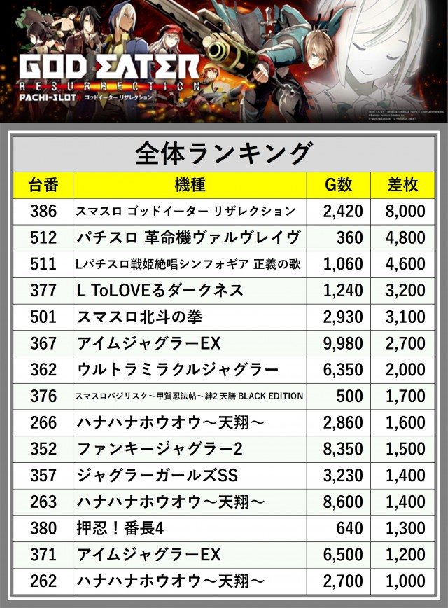 厳選された取材対象機種をはじめ、その他スロット全体から好記録が飛び出した!プレイヤーが楽しんだ1日を下記データにて振り返ってみて欲しい。