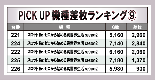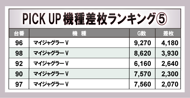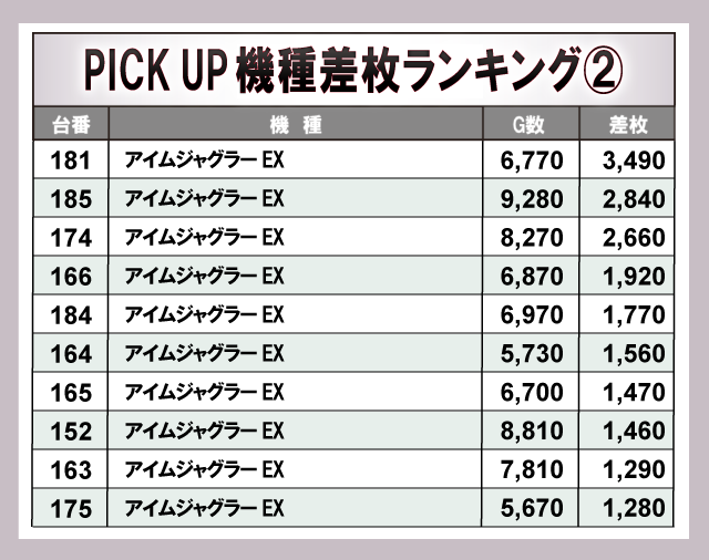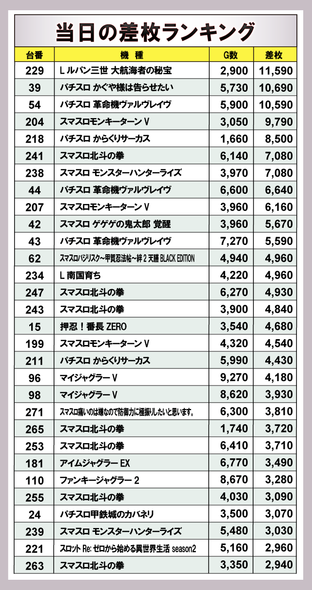 注目の新台『Lルパン三世 大航海者の秘宝』がさっそく万枚OVERを出しており、ファンの期待は自然と高まっていたことだろう。上表の10機種はいずれも高い活気を披露しており、店内の盛り上がりに大きく貢献していた。また、『ジャグラー』シリーズからも大きな熱気が放たれていたのも見逃せないポイントだ。