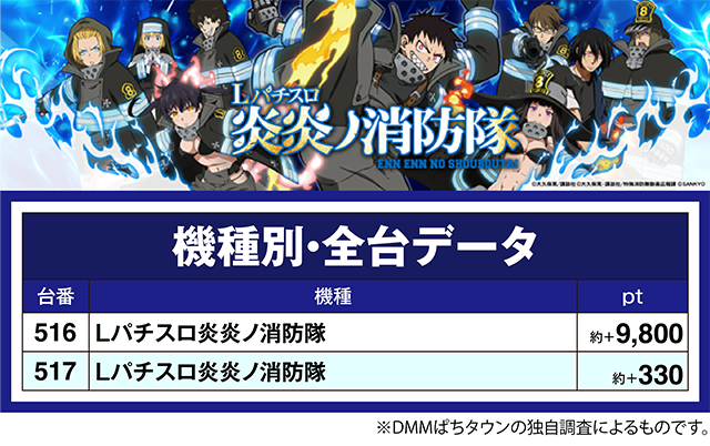 「パチスロ炎炎ノ消防隊」も全台が結果を残し、515番台は約+1,300ptを上回った。