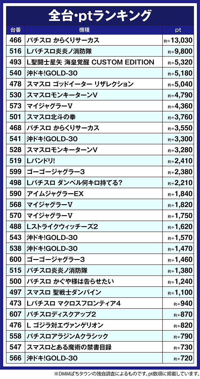 4台が約+1,400ptを超えた「沖ドキ!GOLD-30」は、540番台が約+5,100ptを上回った。