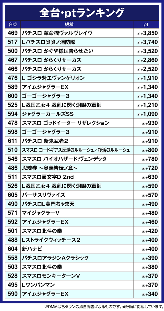 「パチスロ 革命機ヴァルヴレイヴ」の469番台と「Lパチスロ炎炎ノ消防隊」の517番台が約+3,700ptオーバー。