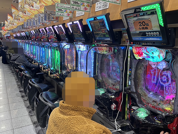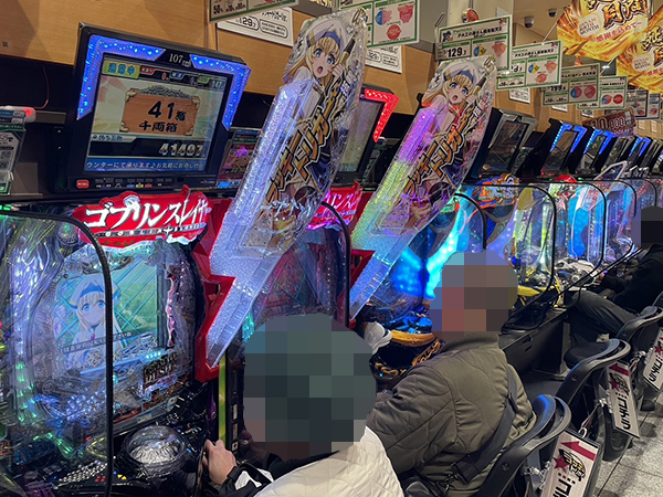 16時ごろの4円パチンコを見てみると「eゴッドイーター TRIPLE BURST」や「eフィーバーからくりサーカス2 魔王ver.」、「Pゴブリンスレイヤー ラッキートリガーVer」が活況。プレイヤーの満足そうな表情から、充実した時間を過ごしていたことがうかがえる。