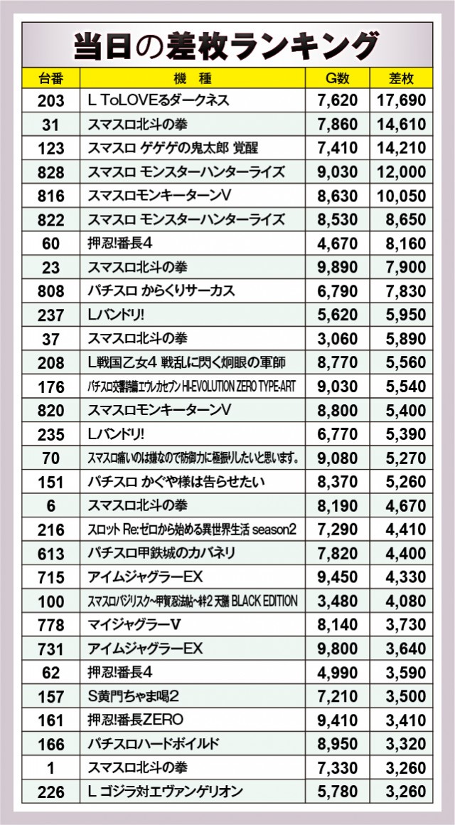 万枚OVERを達成した機種はもちろん、『押忍!番長4』や『パチスロ からくりサーカス』『Lバンドリ!』といった機種群も活躍していた様子が見られる。そして『アイムジャグラーEX』『マイジャグラーⅤ』も回転数と差枚数が比例する展開を披露し、ファンに笑顔をもたらしていたようだ。3~4,000枚OVERとまとまった出玉を確保していた様子も鮮烈で、優秀機種が盛り上がりの中心になっていたのは間違いない。