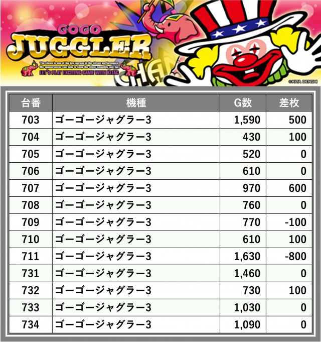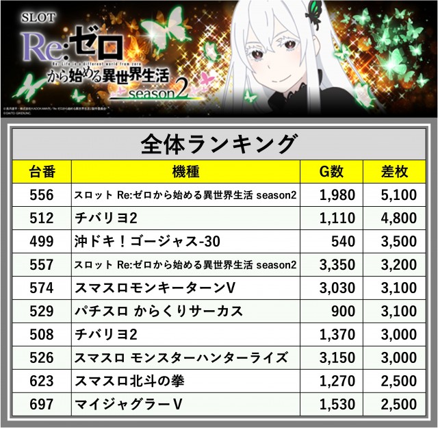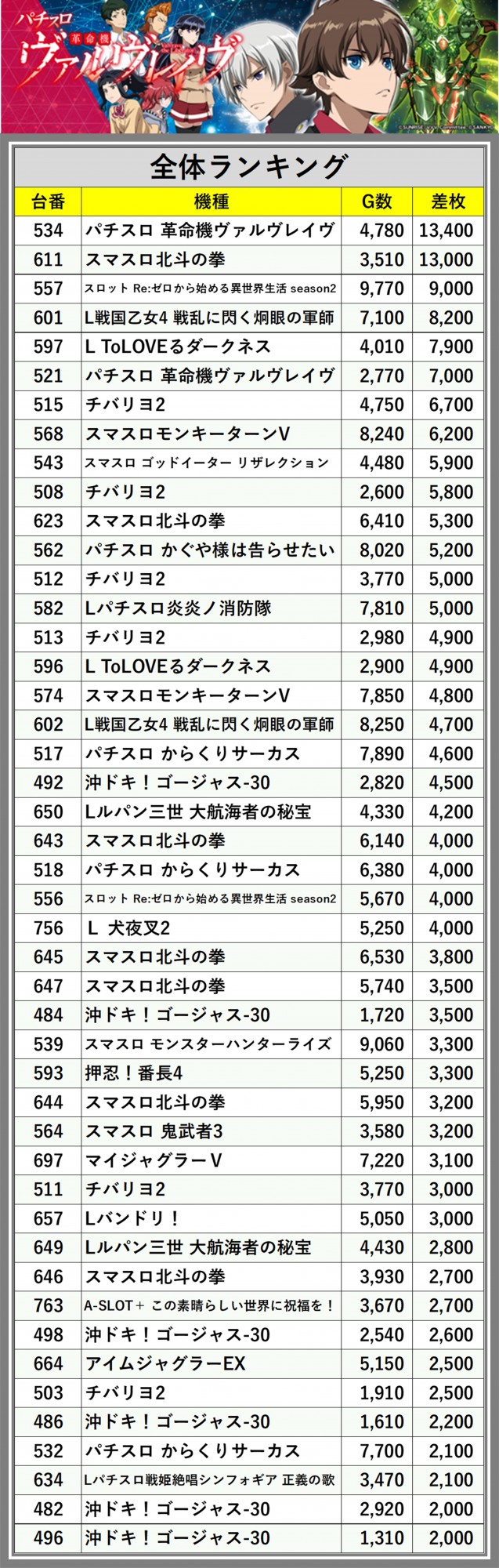 厳選された取材対象機種をはじめ、その他スロット全体から好記録が飛び出した!プレイヤーが楽しんだ1日を下記データにて振り返ってみて欲しい。