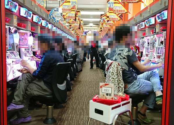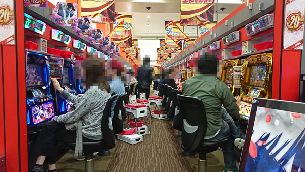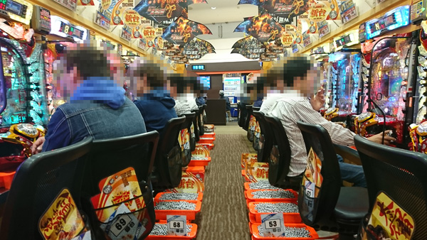 15時を過ぎた頃の20円パチスロを見てみると、「バジリスク~甲賀忍法帖~絆」や「押忍!番長3」が高稼動状態になっており、シマ全体がプレイヤーの活気に包まれていた。