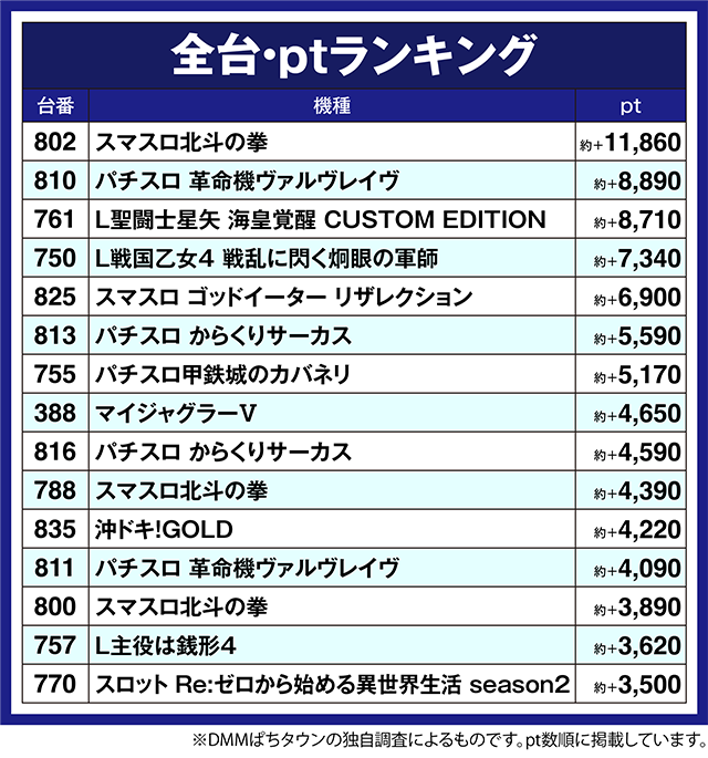ほかにも、「スマスロ ゴッドイーター リザレクション」や「パチスロ からくりサーカス」、「パチスロ甲鉄城のカバネリ」など、多彩な機種に約+5,000ptを超えた台があった。