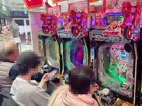 16時ごろの4円パチンコを見てみると「e ソードアート・オンライン 閃光の軌跡」や「P にゃんこ大戦争 多様性のネコ」が活況。プレイヤーの満足そうな表情から、充実した時間を過ごしていたことがうかがえる。