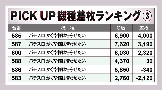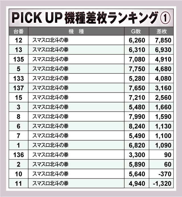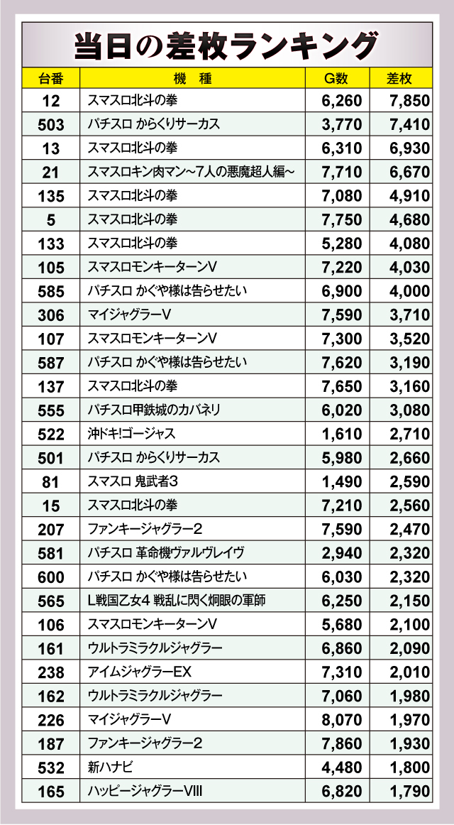 まずは当日の差枚ランキングを紹介していこう。30台のうち25台が差枚+2,000枚オーバーで、+3,000枚オーバーは14台出現。それらのなかでもっとも優秀だった台は、12番台の「スマスロ北斗の拳」で、差枚は+7,850枚を獲得! その他ランクイン機種を見渡すと、最優秀台を獲得した「スマスロ北斗の拳」が大量にランクインするなか、「パチスロ かぐや様は告らせたい」やジャグラーシリーズなど、多くの機種がランクイン。店内全体にチャンスが隠されていたようだ!