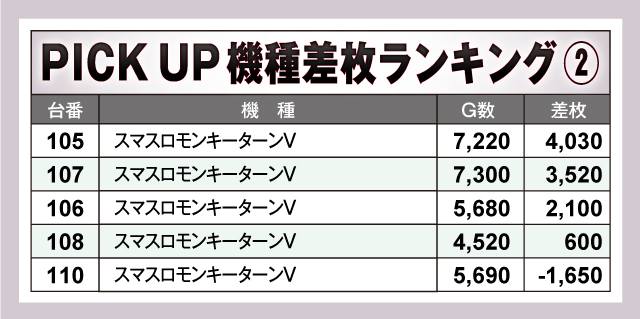 続いては、当日店内を大いに盛り上げた4機種をチェック。4機種すべてから良台が多数出現していたが、注目して欲しいのはやはり「スマスロ北斗の拳」の盛り上がり。ピックアップ16台のうち14台がプラス終了しており、差枚+1,000枚超えは12台で、差枚+4,000枚超えはなんと5台出現と素晴らしい結果をマーク! また、もちろんその他の機種にも好記録がアチコチで出現していた!