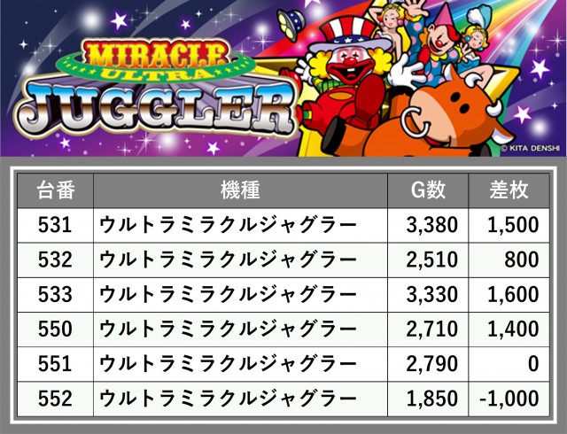 厳選された取材対象機種をはじめ、その他スロット全体から好記録が飛び出した!プレイヤーが楽しんだ1日を下記データにて振り返ってみて欲しい。