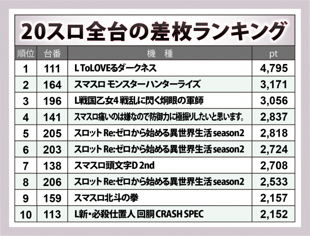 成績順に挙げていくと、『L ToLOVEるダークネス』が+4,800枚弱でトップに立ち、『スマスロ モンスターハンターライズ』の+3,200枚弱、『L戦国乙女4 戦乱に閃く炯眼の軍師』の+3,100枚弱と、流行のスマスロが好調に出玉を量産していた。