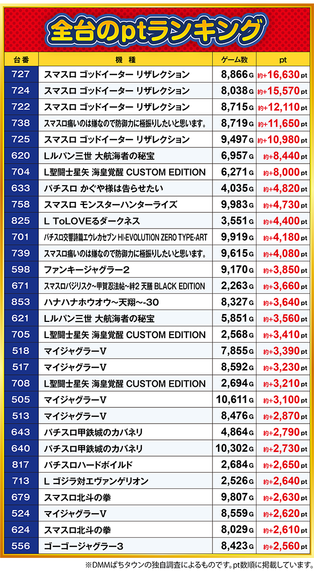 最新機種の「ウルトラミラクルジャグラー」も2台が約+2,600ptを超え、517番台は約+4,330ptとなった。