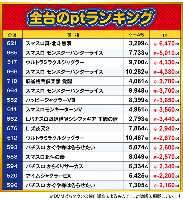 最新機種の「ウルトラミラクルジャグラー」も2台が約+2,600ptを超え、517番台は約+4,330ptとなった。