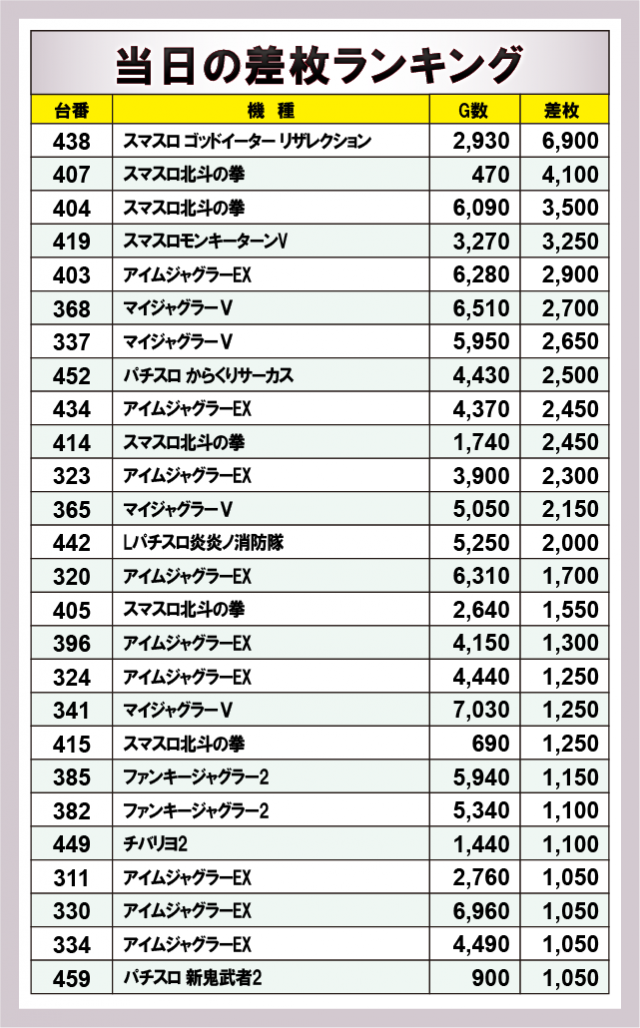 優秀台に目を通してみると、差枚数で大きな数字を打ち立てたのが『スマスロ ゴッドイーター リザレクション』で+6,900枚を記録!さらに『スマスロ北斗の拳』『スマスロモンキーターンV』がつづき、そのほか『ジャグラー』シリーズも多数ランクインしており、各エリアで大きな熱気が放たれていた。