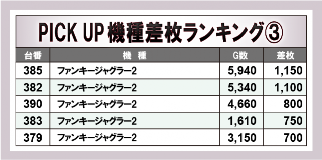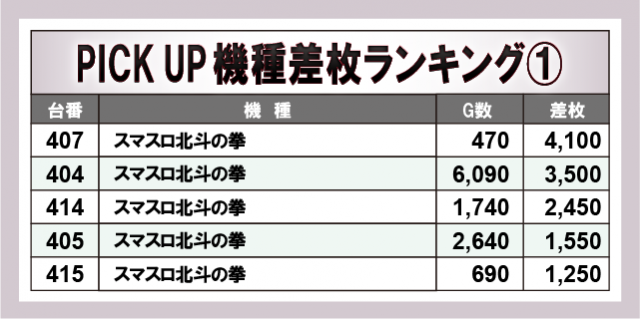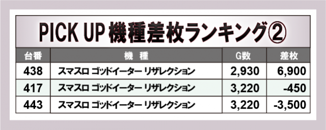 上表の3機種から4桁プラス台が多数発生し、ファンが自信をもってレバーを叩いていた様子が目に浮かぶ。いずれも同店が丁寧に扱っていると窺うことができ、今後も要注目のエリアなのは間違いないだろう。
