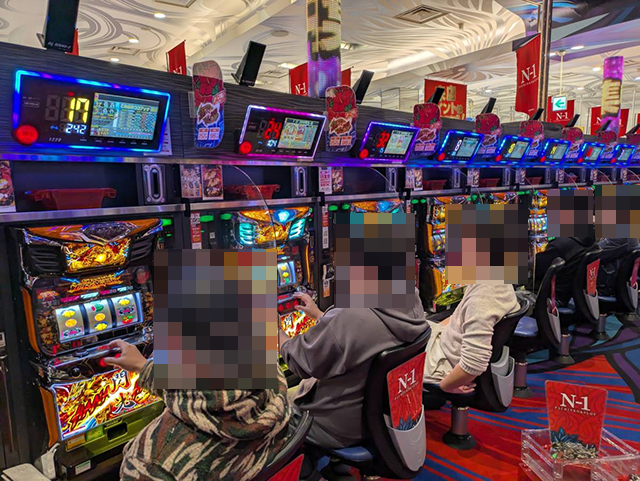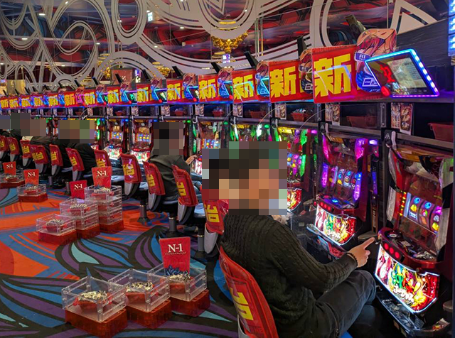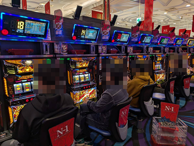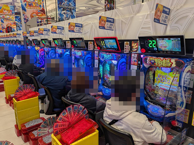 プレイヤーたちは2箱以上や3箱以上の持ち玉を使い、楽しそうに遊技中。