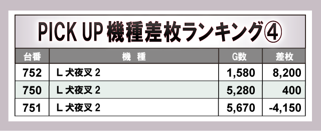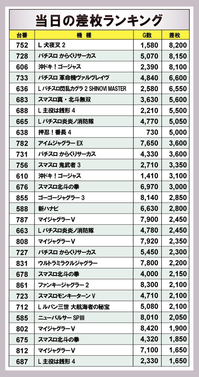 当日は『L 犬夜叉2』『パチスロ からくりサーカス』『沖ドキ!ゴージャス』から+8,000枚OVERが発生し、店内の盛り上がりを牽引する存在となっていた。これに『パチスロ 革命機ヴァルヴレイヴ』『Lパチスロ閃乱カグラ2 SHINOVI MASTER』と続いており、あらゆる機種がポテンシャルを持っていたと言えるだろう。