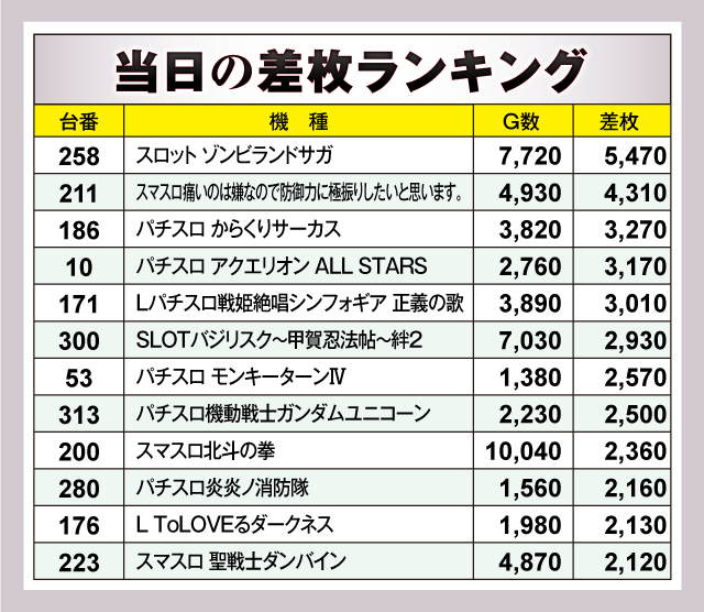 当日の差枚ランキングを見てみると、12台すべてが差枚+2,000枚オーバーで、+3,000枚オーバーは5台出現。それらのなかでもっとも優秀だった台は、258番台の「スロット ゾンビランドサガ」で、差枚は+5,470枚を獲得! またその他ランクイン機種を見渡すと、スマスロから6.5号機まで多くの機種がランクイン。幅広い機種にチャンスが隠されていたようだ!
