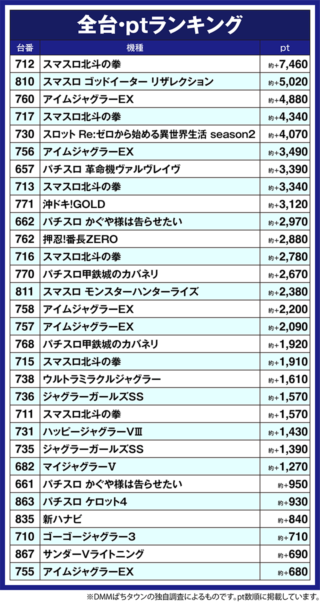 ほかにも、「スロット Re:ゼロから始める異世界生活 season2」の730番台や「沖ドキ!GOLD」の771番台などが約+3,000pt以上となった。