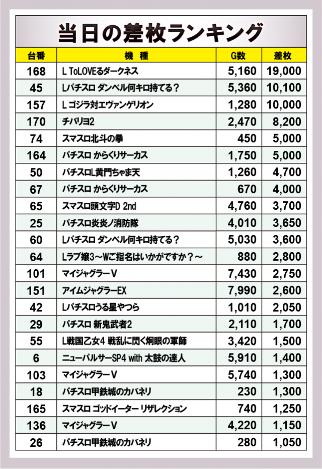 上表をご覧の通り、『L ToLOVEるダークネス』『Lパチスロ ダンベル何キロ持てる?』『L ゴジラ対エヴァンゲリオン』から3台の万枚OVERが生まれ、当日の店内の熱気を大きく引き上げた。ほかにも『チバリヨ2』で8,000枚OVERと気を吐いており、まとまった出玉を確保する台の多さにファンは高揚感を抑えられなかったことだろう。