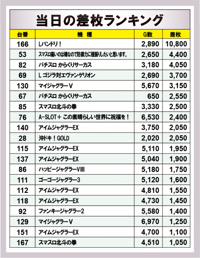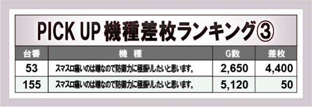 上表の5機種は『アイムジャグラーEX』から多くの台でまとまった出玉を獲得するほか、少数設置機種もポテンシャルを存分に発揮していたのも見逃せないポイントだ。いずれも大きなマイナスが見られないのが特徴的で、優秀機種としてしっかりと熱を帯びていた内容となった。