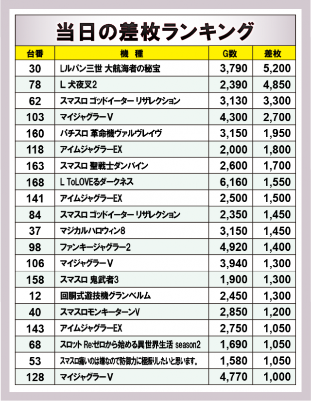 最新台『Lルパン三世 大航海者の秘宝』で5,000枚OVERと大台突破を果たした。さらに『L 犬夜叉2』で4,000枚OVER、『スマスロ ゴッドイーター リザレクション』で3,000枚OVERをマークするなど、スマスロ機の活躍が目立った。しかし、『ジャグラー』シリーズも多数ランクインし、店内のあらゆる機種が名を連ねているのも目に焼きつく点で、その盛り上がりにファンは歓喜していたことだろう。