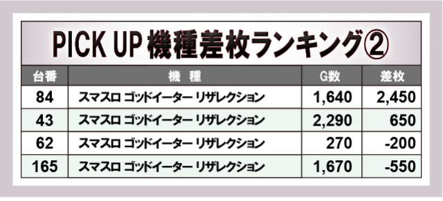 当日特に盛り上がりを見せていた機種に注目してみると、『Lバンドリ!』『スマスロ ゴッドイーター リザレクション』『スマスロモンキーターンV』では、プラス差枚台の割合が高くなっており、ホール内でも特出して大きな熱気を放っていたようだ。