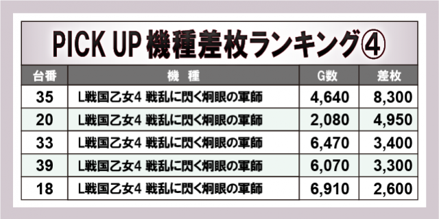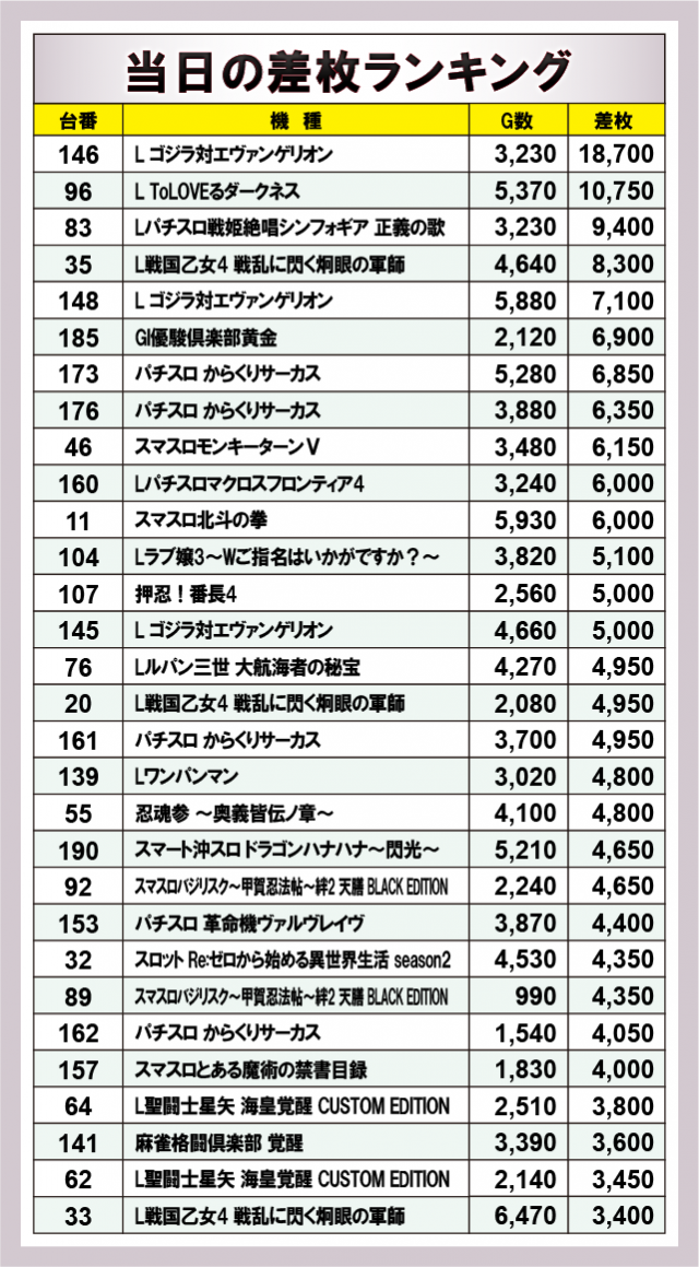 上表をご覧の通り、TOP30台は3,000枚OVERからとなっており、その中で『L ゴジラ対エヴァンゲリオン』『L ToLOVEるダークネス』から2台の万枚OVERが発生。さらに『Lパチスロ戦姫絶唱シンフォギア 正義の歌』で9,000枚OVER、『L戦国乙女4 戦乱に閃く炯眼の軍師』で8,000枚OVERがつづき、スマスロ人気機種を中心に相当な手応えを感じていたのは確かだ。