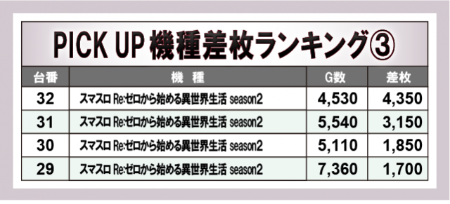 上表に名を連ねた優秀機種はいずれも高い活気を披露しており、万枚OVERはもちろん、各エリアでまとまった出玉を確保する台が複数発生し、ファンの意欲を掻き立てていた。その中でも『L ゴジラ対エヴァンゲリオン』『スロット Re:ゼロから始める異世界生活 season2』『スマスロモンキーターンV』は全台プラス差枚を叩き出し、遊技するファンも好感触を得ては時間の許す限りレバーを叩いていたことだろう。