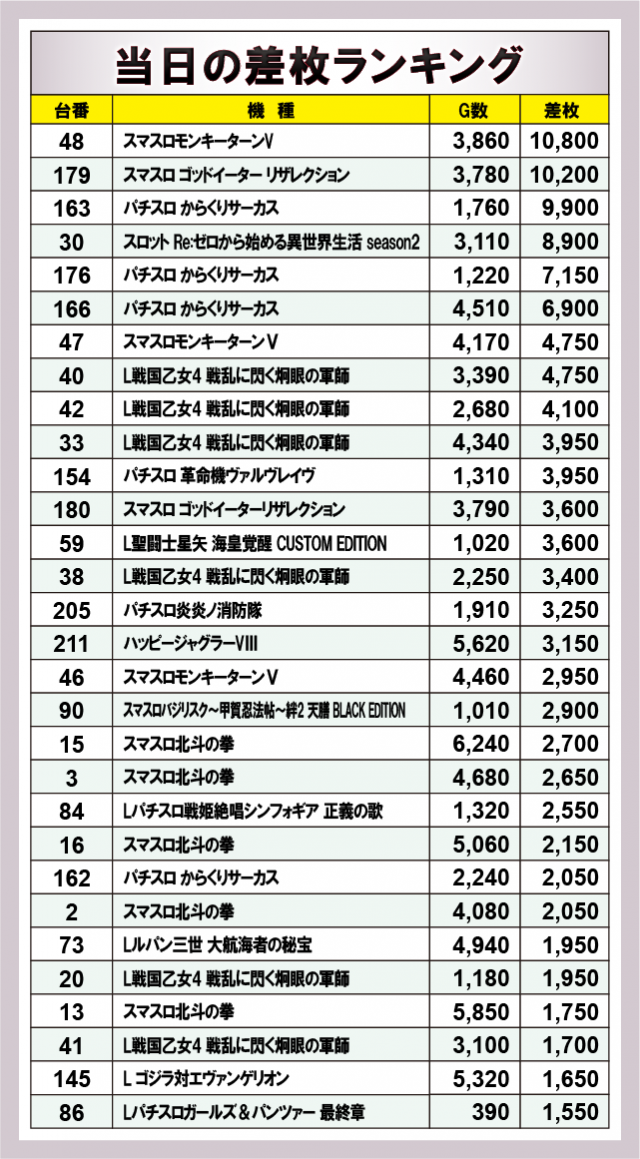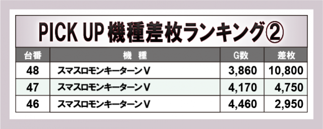 上表に名を連ねた優秀機種は、いずれも高い活気と熱気を披露していたのが特徴的だ。その中で『スマスロモンキーターンV』は万枚OVER台を筆頭に全台プラス差枚を達成し、ひと際存在感を放っていた。遊技するファンも好感触を得ては、時間の許す限りレバーを叩いていたことだろう。