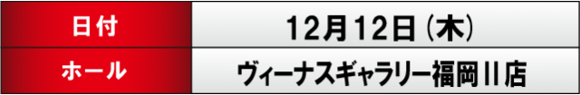 12月12日、『ヴィーナスギャラリー福岡Ⅱ店』にて「キングフッキー君 独占取材」が実施された。この日は福岡県のヴィーナスギャラリー4店舗で同時実施ということもあり、誰もが大きな期待を抱いており、それは信頼と言い換えることができるだろう。果たして同店は駆けつけたファンの想いに応えることができたのか…さっそく詳細データとともに、店内の様子をお伝えしていくぞ!