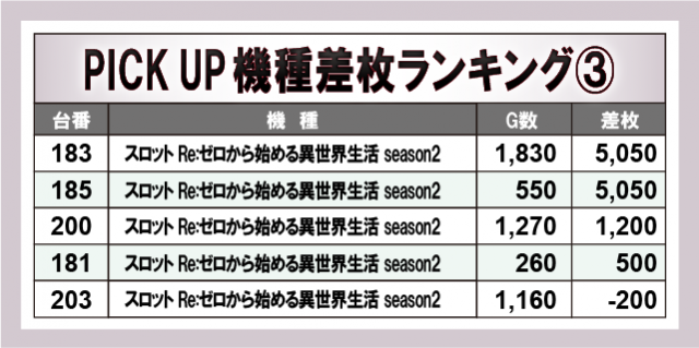 『L 犬夜叉2』『スマスロ ゴッドイーター リザレクション』『スロット Re:ゼロから始める異世界生活 season2』『パチスロ からくりサーカス』といったスマスロ人気機種の活躍が目立つばかりか、メダル機の『沖ドキ!GOLD』も奮闘しており、いずれの台も熱気が噴出していたのはもちろん、高い活気にも満ちていたのが印象的だ。
