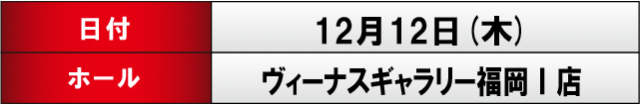 12月12日、昨日に続き『ヴィーナスギャラリー福岡Ⅰ店』にて「キングフッキー君 独占取材」が連続実施された。過去回では何度も万枚オーバー台を輩出しているが、この日はどうだったのだろうか。さっそく詳細データとともに、店内の様子をお伝えしていこう!