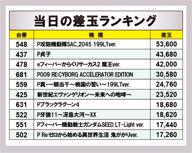 パチンココーナーでは『P攻殻機動隊SAC_2045 199LTver.』から5万発OVERと凄まじい記録が飛び出した!さらに『P貞子』『eフィーバーからくりサーカス2 魔王ver.』が4万発OVERと追随。そのほか各所で相当な手応えを感じていた様子が窺える。