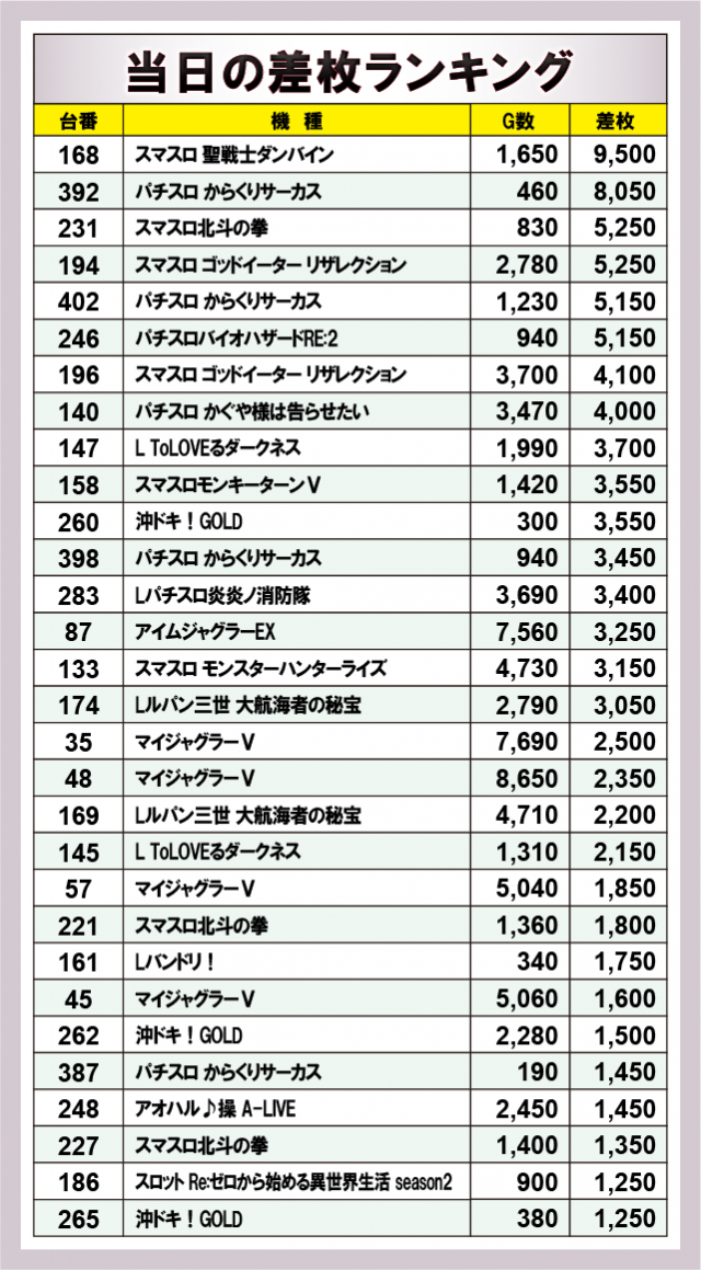 惜しくも万枚台は発生しなかったが『スマスロ 聖戦士ダンバイン』から9,000枚OVERが生まれ、『パチスロ からくりサーカス』も8,000枚OVERと追随。さらに『パチスロバイオハザードRE:2』『沖ドキ!GOLD』『ジャグラー』シリーズといったメダル機も負けず劣らずポテンシャルを発揮しており、遊技するファンは有意義な時間を過ごしていたのは確かだろう。