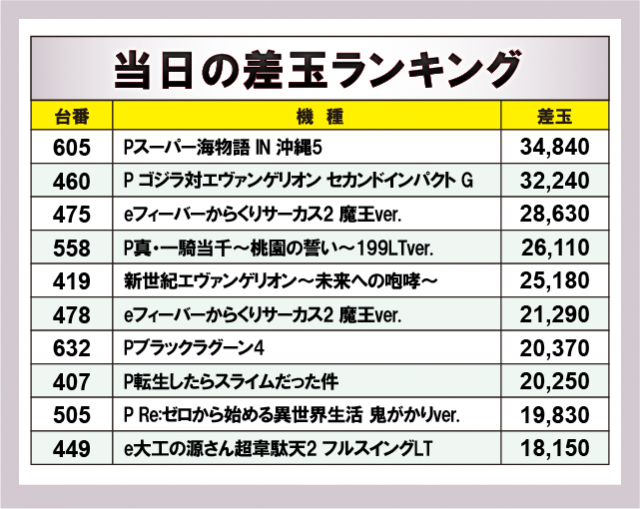 パチンココーナーでは、『Pスーパー海物語 IN 沖縄5』『P ゴジラ対エヴァンゲリオン セカンドインパクト G』で3万発OVERと盛り上がりを牽引。さらに『eフィーバーからくりサーカス2 魔王ver.』『P真・一騎当千~桃園の誓い~199LTver.』などが続き、定番機種から新台まで様々な機種にチャンスが隠されていたようだ。
