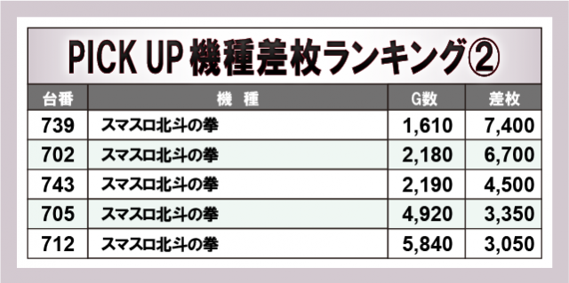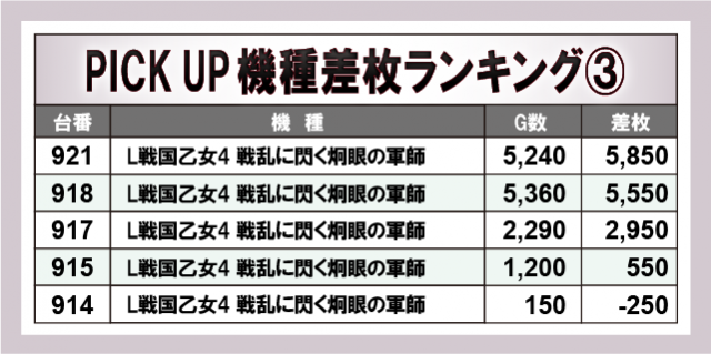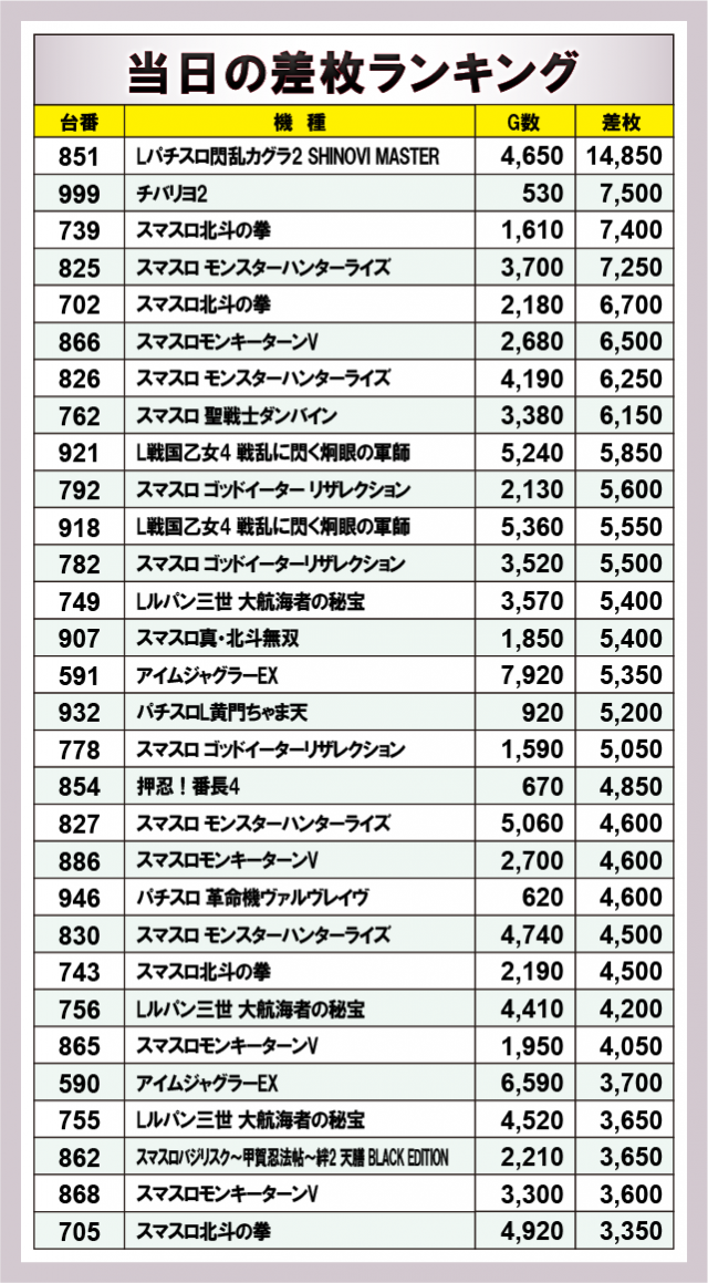 上表に注目してみると、『アイムジャグラーEX』『スマスロ北斗の拳』『L戦国乙女4 戦乱に閃く炯眼の軍師』『スマスロ モンスターハンターライズ』『Lパチスロ閃乱カグラ2 SHINOVI MASTER』といった人気機種から多数の優秀台が存在し、ホール中で大いに盛り上がりを見せていた。