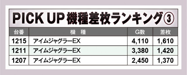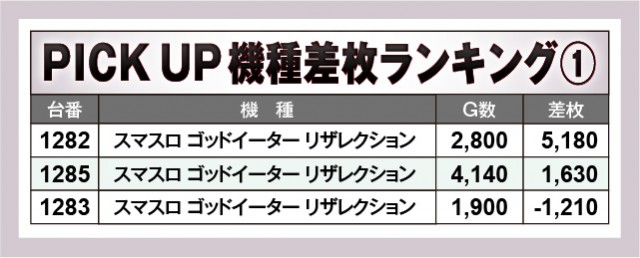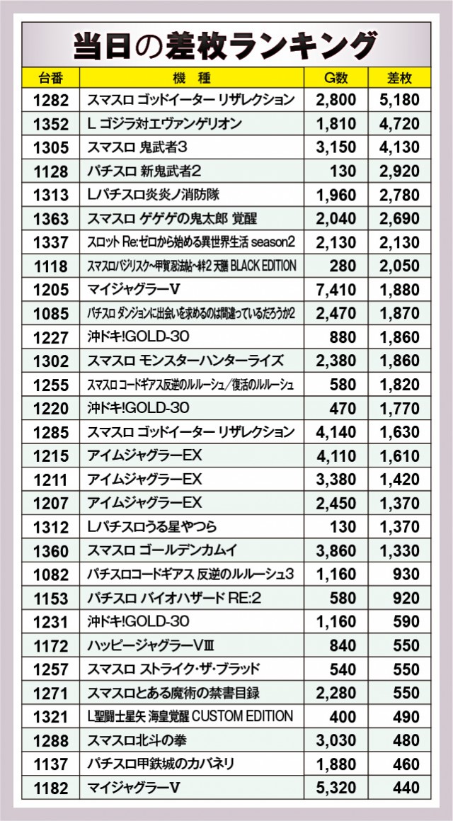 上表をご覧の通り、今回も館内に設置されたあらゆる機種が活躍した状況となった。その中で『スマスロ ゴッドイーター リザレクション』が5,000枚OVERと奮起し、『L ゴジラ対エヴァンゲリオン』『スマスロ 鬼武者3』も4,000枚OVERで追随。もちろん沖スロ・ノーマル機の活躍も見て取れる内容で、ファンは選択肢が広い状況に歓喜していたことだろう。