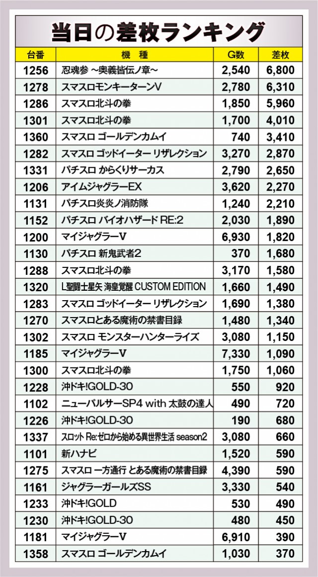 上表に名を連ねた機種は幅広いものとなっており、館内に設置されたあらゆる機種に可能性が眠っていた様子が窺える。当日は『忍魂参 ~奥義皆伝ノ章~』『スマスロモンキーターンV』から6,000枚OVERが放たれ、盛り上がりをリードする存在として君臨。AT機のみならず、『アイムジャグラーEX』『マイジャグラーⅤ』といったノーマル機も存在感を放っており、ファンは選択肢の多さに悩みを抱えていたかもしれない。