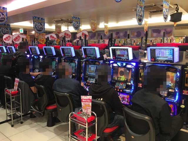 20円パチスロをみると、「バジリスク~甲賀忍法帖~絆」や「ミリオンゴッド-神々の凱旋-」、「アナザーゴッドハーデス」などの定番機種が好評。理想的といえる展開に笑みを浮かべているプレイヤーの姿もあった。