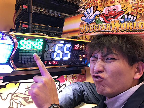 開店前からやる気は十分! 実戦機種には「ニューアイムジャグラーEX」を選び、遊技とマイクで自身をアピールしていく!!