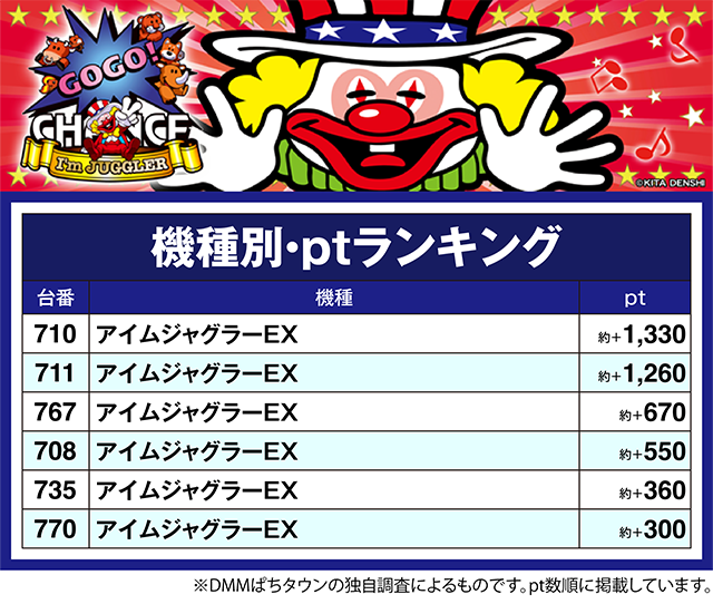 「アイムジャグラーEX」では、710番台と711番台が約+1,200ptオーバー。
