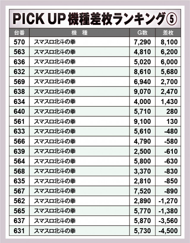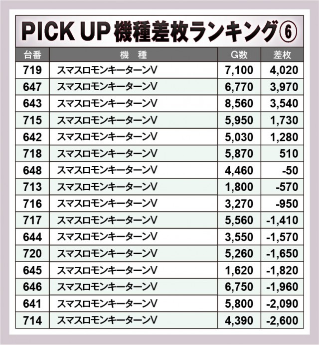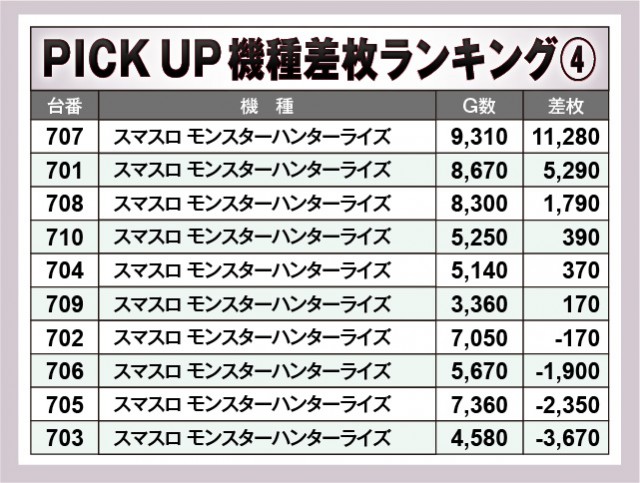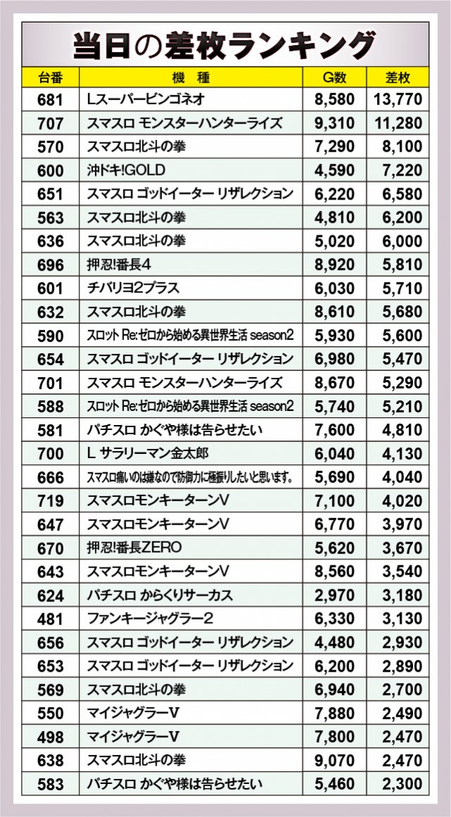 『Lスーパービンゴネオ』『スマスロ モンスターハンターライズ』にて万枚OVERが飛び出し、当日の店内を彩っていた。『スマスロ北斗の拳』や『沖ドキ!GOLD』なども7~8,000枚OVERと奮起しており、大台突破台が多数生まれているのも見逃せない。また高い回転数を記録している点も印象的で、じっくりと打ち込まれた事実から、遊技ファンは相当な手応えを感じていたことだろう。