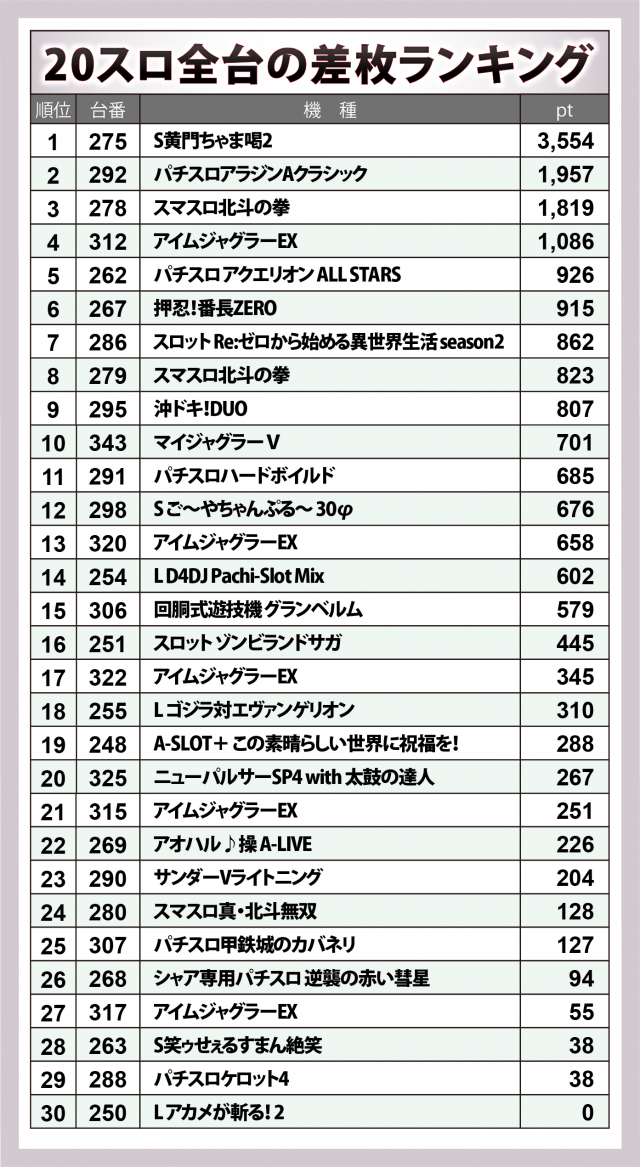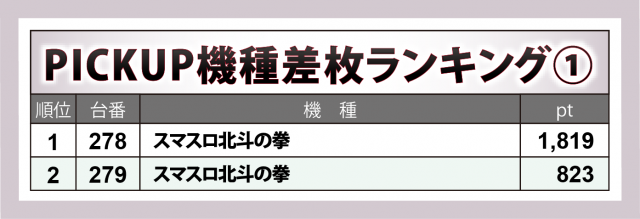 上から順に挙げていくと、『S黄門ちゃま喝2』が+3千6百弱、『パチスロアラジンAクラシック』が+2千弱、『スマスロ北斗の拳』が+1千8百超、『アイムジャグラーEX』が+1千1百弱を計上した。