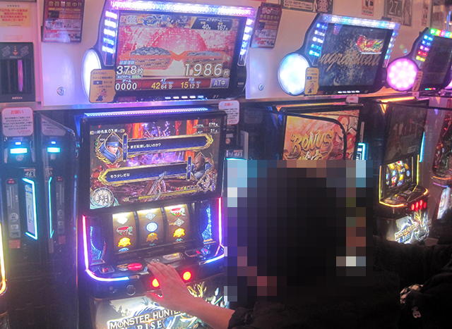 14時半過ぎの「スマスロ モンスターハンターライズ」は2名が着席しており、どちらも笑顔で遊技をおこなっていた。