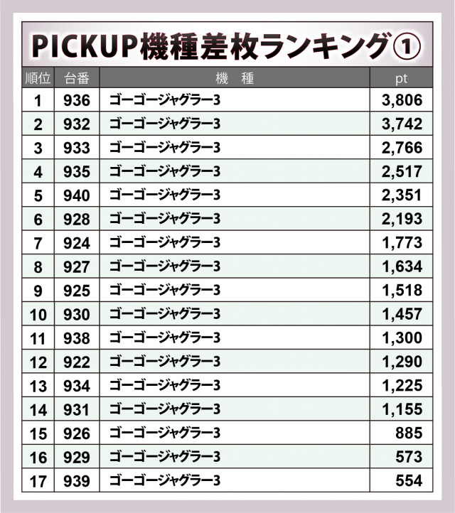 『ゴージャグ』20台ではマイナスになったのは3台のみ。936番台が+3千8百超&937番台が+3千7百超でツートップとなった上に、+2千超×4・+1千超×8と、シマ全体で好況に到った。