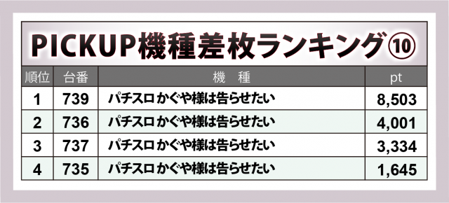 6台に数を増した『パチスロ かぐや様は告らせたい』も他に匹敵。739番台が+8千5百超で機種トップ、+4千超・+3千3百超・+1千6百超が1台ずつと、重量級の出玉がズラリ。